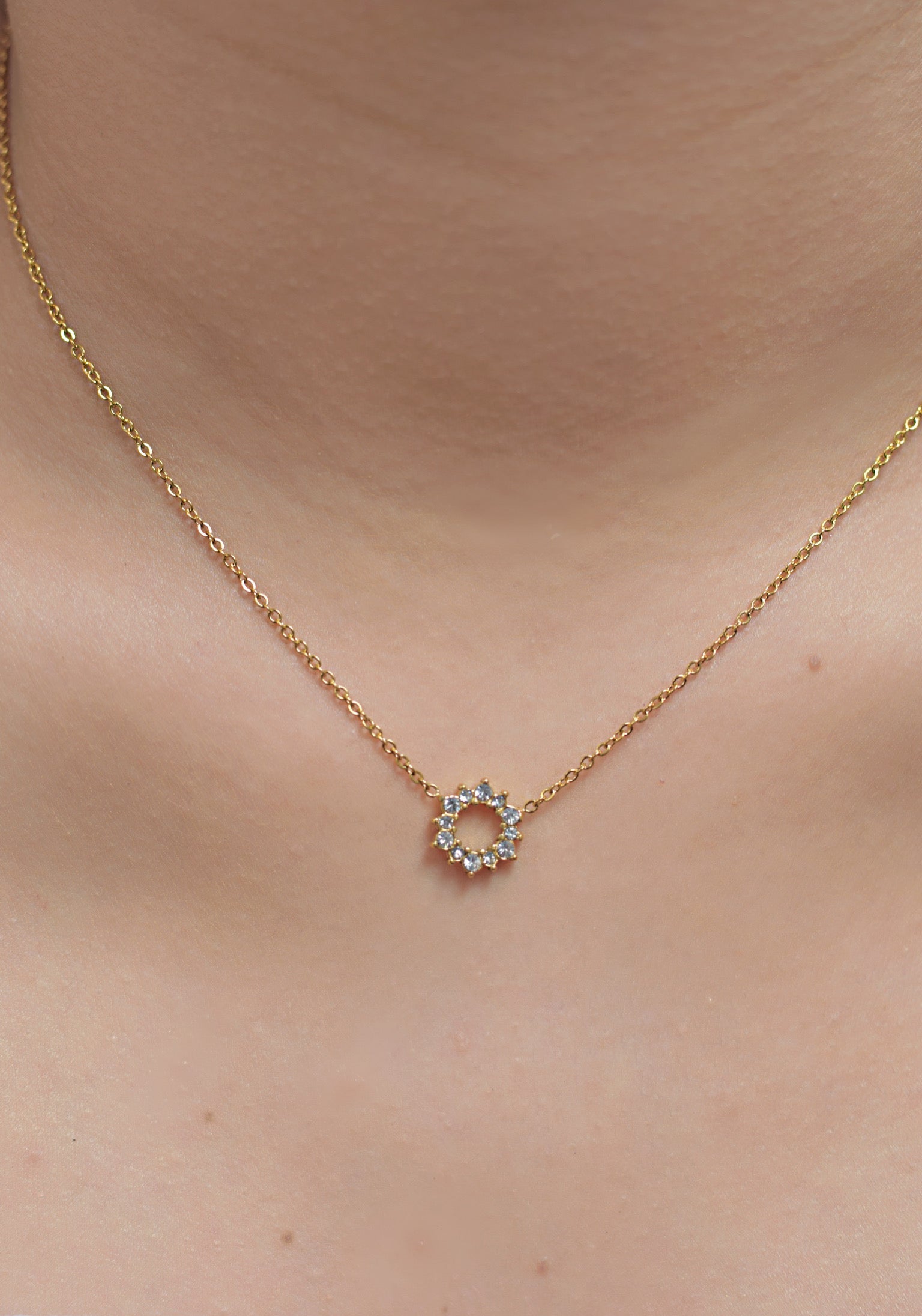 Añade un toque de brillo que transforma cualquier estilo con este collar. El dije circular, decorado con zirconias, captura la armonía y energía del sol, simbolizando fuerza y belleza interior. Perfecto para realzar tu luz propia con elegancia y significado.
